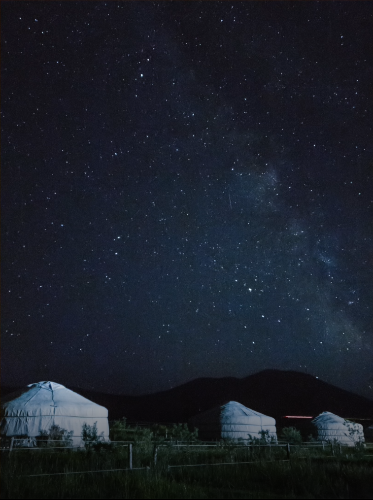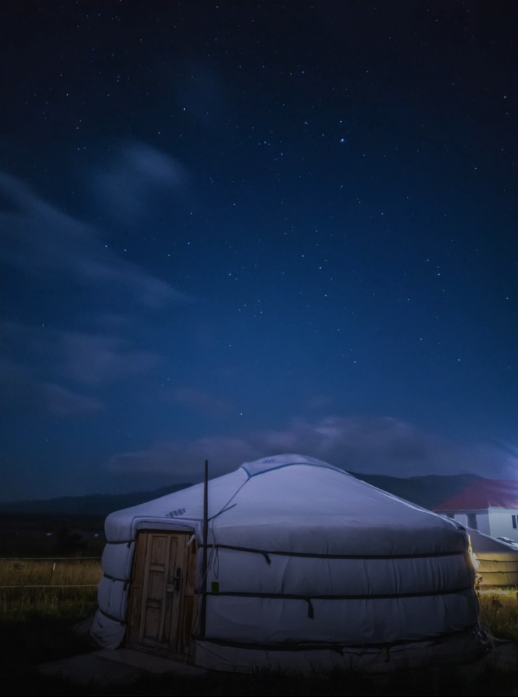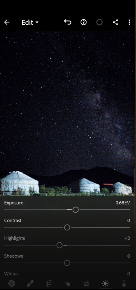 适当的调节曝光度exposure,使星星细节更加好,然后发现前面的蒙古包过曝了,就调低亮部highlights。