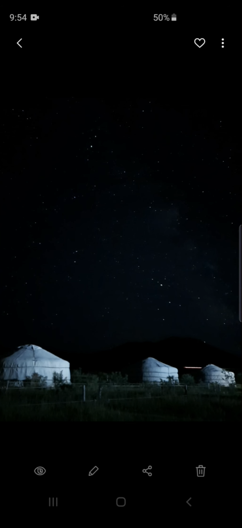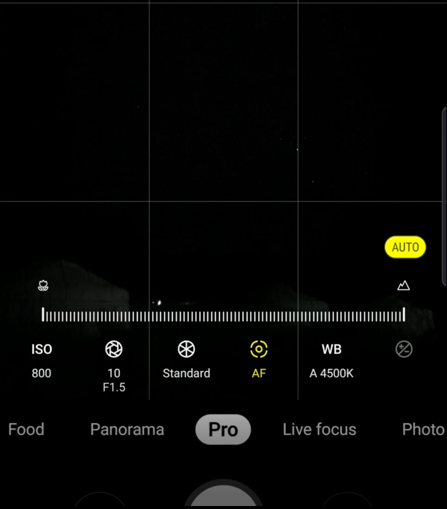 - 光圈和曝光时间的调节。要让更多的光线进入相机,这里选择F1.5(我的手机有F2.4和F1.5两个光圈,选择大光圈的1.5,数值小的大光圈),如果是EV自动曝光就不用管了。曝光时间选择最长10s(有更长拉更长拉最长)。