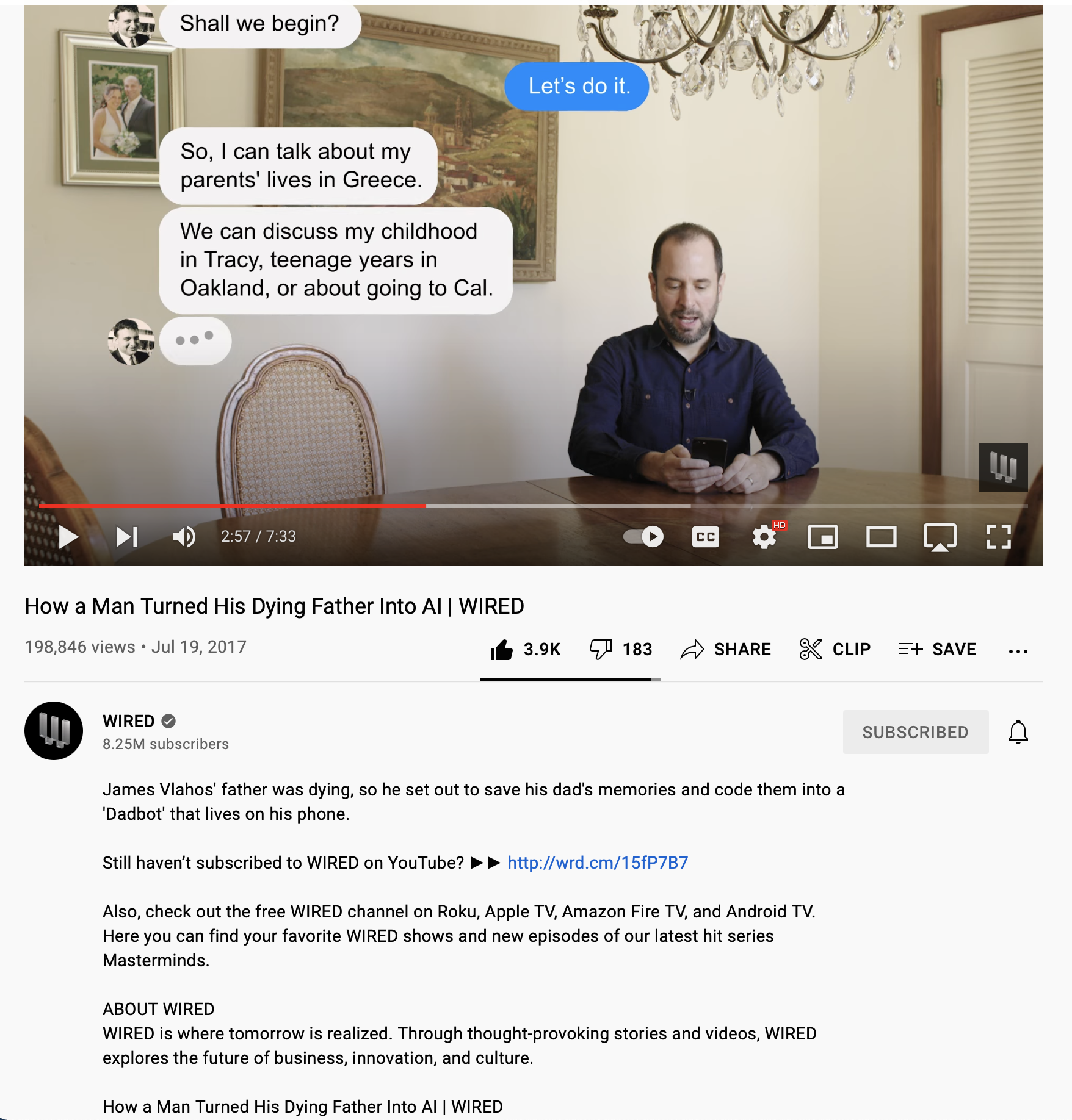 在哈利波特的世界里,你可以通过照片和照片里的人物对话————即使人过世了也一样可以。现在这个不可思议的场景变成了现实。月复一月,一位新闻工作者兼计算机工程师录制了他父亲一生的故事,然后用这些故事重塑了一个AI父亲————Dadbot。
