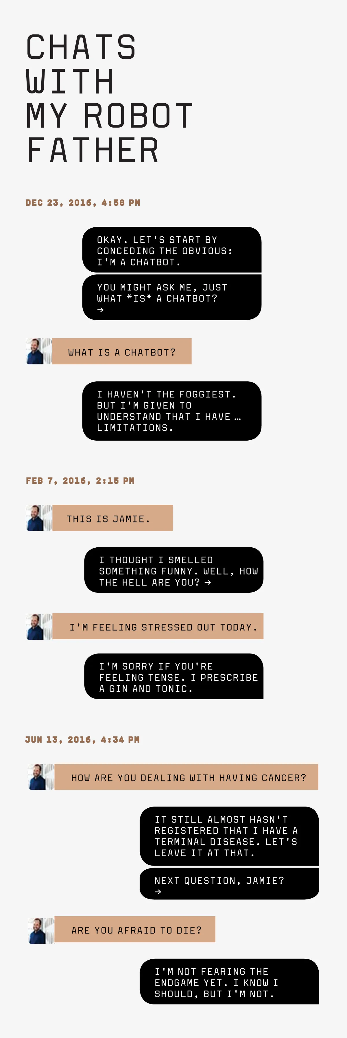 正如我已经考虑过着手创造一个 Dadbot 意味着什么(这个名字太可爱了,它已经印在了我的脑海中),我列出了一系列利弊,利弊堆积如山。正是在我真正的爸爸快要死的时候创造一个 Dadbot 可能会很痛苦,特别是他会比现在变得更加病态。