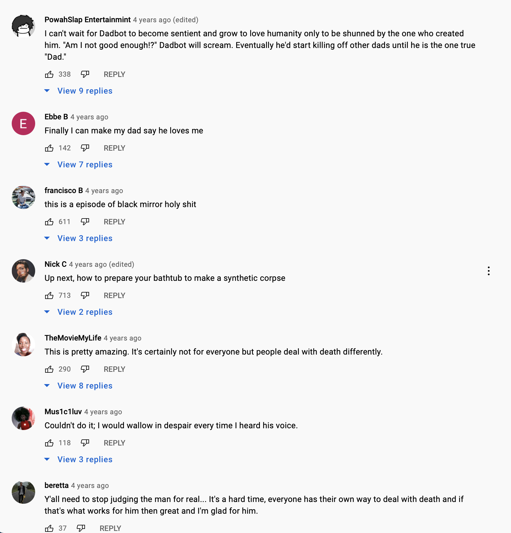 我的兄弟对我的顾虑感到不解。他认为我建议做的事情绝对是正确的,但这并不会让事情变得糟糕。 “我希望有个 Dadbot。”他说。